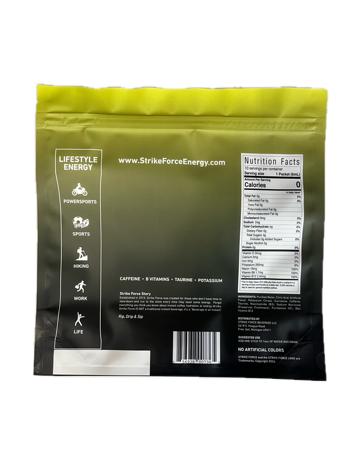Power up your day with Strike Force Energy Drink Mix - Lemon Flavor, the zesty, sugar-free liquid energy shot that turns any 16.9 oz (500 ml) drink into a refreshing, high-octane energy drink! Designed for athletes, professionals, and anyone needing a quick, clean energy kick, each packet packs 160 mg of caffeine, taurine, potassium, and B vitamins in a portable, easy-to-use liquid form. No powders, no mess—just pure, citrus-fueled performance.